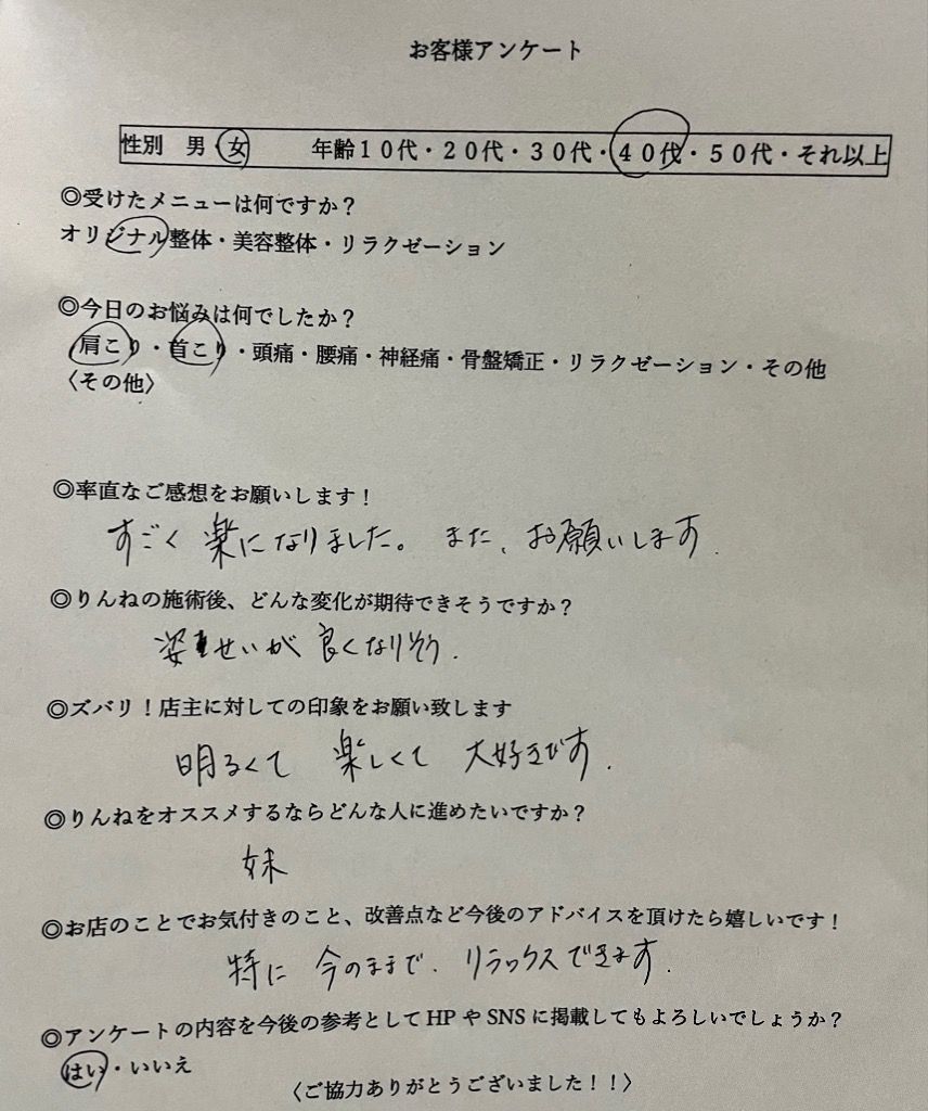 あっという間の1時間半 20代女性 職場の同僚に紹介されて。先生のご自宅ということもあり、住宅地にあります。他のお客さんと被ることがなく人見知りな私には合っていました。施術は痛みがなく、ウトウトしている内にあっという間の1時間半。身体に合わせた施術を組んでくれるので、安心してお任せできた。整体は以前から通いたいと思っていたのですが、初めてをここにして良かった!!翌日すっかり軽くなり驚きです!!!効果が続くといいなぁ 次回もまたよろしくお願いします(*^^*) 頭痛が楽になった 30代女性 美彫骨整体?の頭痛改善が気になって通いました。偏頭痛持ちで頭痛薬を週2回使ってました。頭蓋骨が歪んでいたらしく、まずは3回続けてみましょうと言われ定期的にうけました。気がついたら一ヶ月近く頭痛薬を飲んでいません。お世話になっています。 楽になった。 30代 女性 上半身ケア 口コミが良かったので思い切って予約。住宅地で戸惑いましたが、優しく出迎えてくださり緊張が解けました。とにかく背中が張ってすがるような気持ちでした。肩周りすごい楽!雰囲気も良いし女性で話しやすい。またお願いします。 よかったです 30代 女性 もみほぐし もみほぐしをお願いしました。帰宅後だるかったけど翌朝はスッキリ目覚めた。よく眠れた。 指圧がちょうどいい 30代 女性 上半身ケア+アロマ 背中が苦しくて全身整体を希望。カウンセリングで説明を受け、結局全身整体じゃないアロマタッチと上半身ケアをうけました。他のお店では触られるだけでも痛かったので、よく見てるなと思いました。丁寧な説明でよかった。 すごく楽になりました。 40代・女性 頭痛ケア 【率直なご感想をお願いします】すごく楽になりました。また、お願いします【どんな変化が期待できそうですか?】姿勢が良くなりそう【店主の印象は?】明るくて、楽しくて、大好きです【どんな人にオススメしたい?】妹